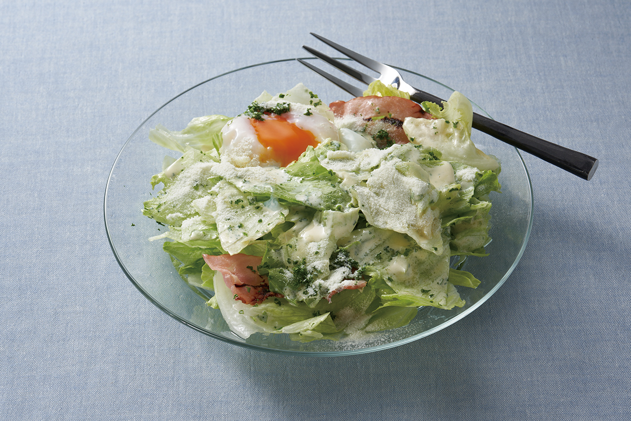 温泉卵を作る。コーヒーカップに水1/4カップを入れ、冷蔵庫から出したばかりの卵を割り入れる。このとき、卵の上に水がかぶっていることを確認する。皿をかぶせ、電子レンジ600Wで50秒加熱。取り出して湯を捨てる。